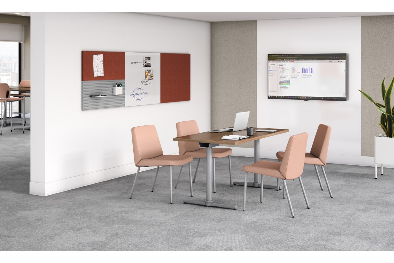 HFCG6.SNBLE23.PR8 - Flock guest chair; HCTRECT3060.N.PINC.PINC - Arrange rectangle table top; HCT29MT.PR8 - Arrange T-leg cafe table base; HCTSQR42N - Table Top; HSCS2.N.E.SNBLE23.PR8 – Arrange café height Stool; HWWT4524F.NBLE40 - Workwall Fabric Tile; HWWAP.PJW - Workwall Hanging File Folder; HWWAC.PJW - Workwall cup accessory; HWWARAIL24.PR6 - Workwall Tool Rail Accessory; HWWAH.PJW - Workwall Hook
