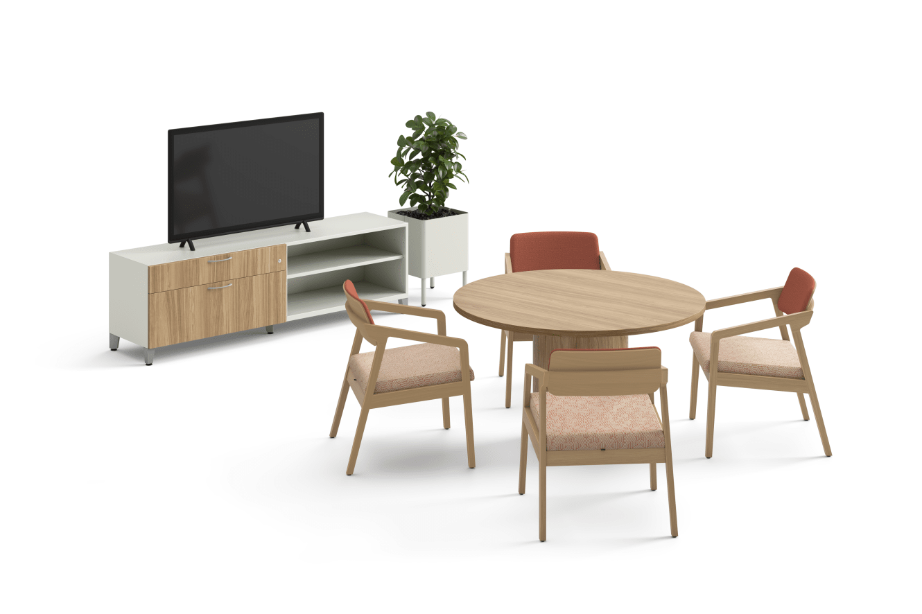 HWCUSPBA; HTLR4.LFC1 - Preside laminate cylinder base; HTLD48.GFC.N.LFC1 - Preside 48" round laminate table top; HSCF227218RBFOL.SFT1.SPR6.PK7.LFC1.PK7.L - Contain footed low credenza with laminate drawer fronts; HTLSCUSQRPLNT30L.PK7.G - Sculpt square low planter;