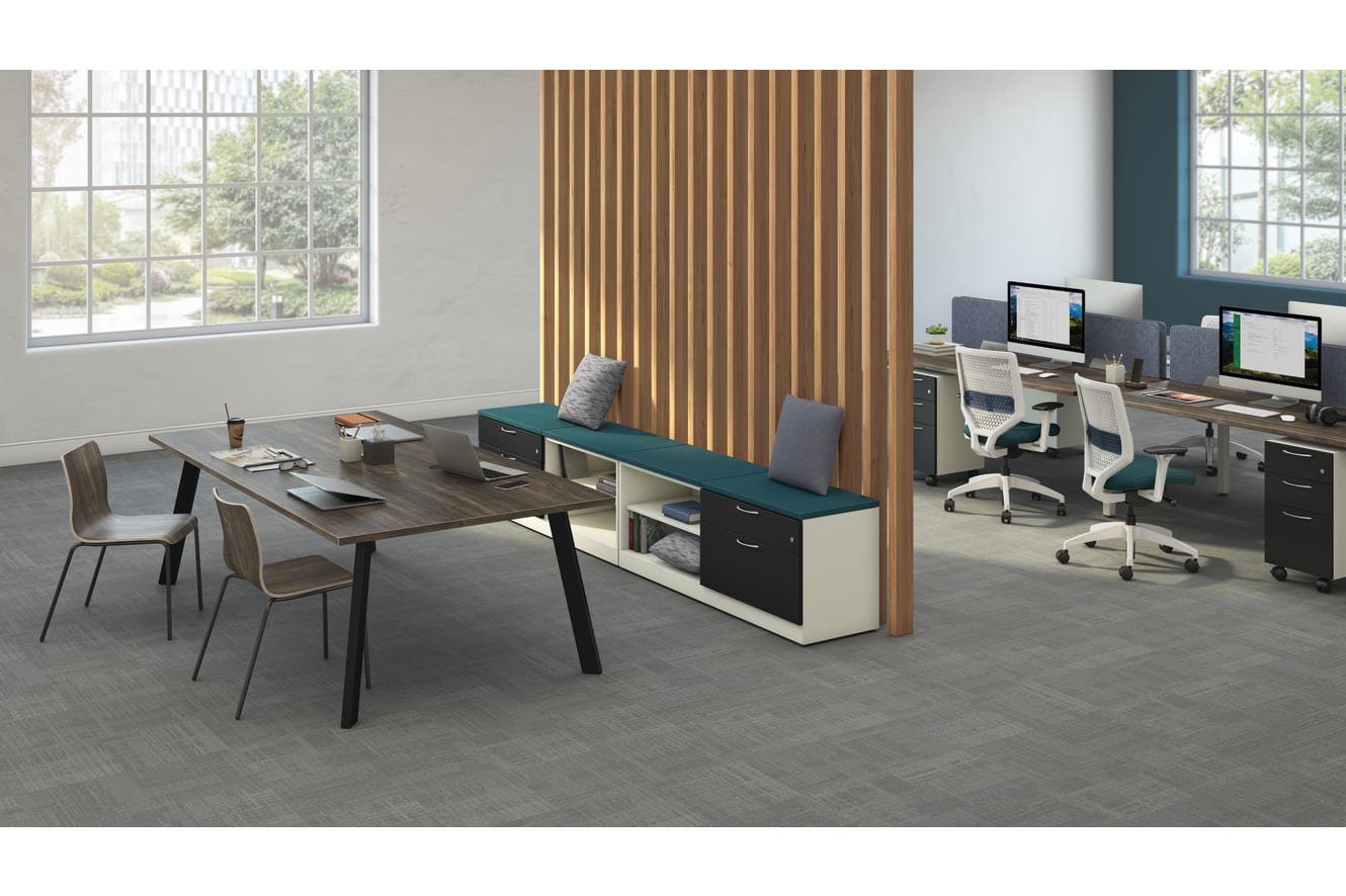 HSCP226018RBFOM.BX.APR0.LOFT.P.LOFT.L - Low Credenza, Box/Lateral Left, Open Shelf Right; HSCP226018LBFOM.BX.APR0.LOFT.P.LOFT.L - Low Credenza, Box/Lateral Right, Open Shelf Left; HTLC4869.GFW.N.LFW1 - Preside Rectangle Laminate Top; HT29AL96.P - Preside Angled Legs HRUCK1L.LFW1.P6P; Ruck Chair - Laminate Shell HSPM271518BBFM.A.PR0.LOFT.P.LOFT.L - Contain Mobile Pedestal, B/B/F; HMP2472PK4.LFW1.FW.LOFT.LOFT - Empower4-Pack Bundle; HUVDSAOEM1372.DGY3.PR6 - Empower Desktop Screens; HSLVTMRS.Y2.ADW.S.DW.SMHMCHI32.RE.SB.DW - Solve Task Chair; HWHSP18.ENSB39 - HON Throw Pillow; HWHSP18.SMHMMAN31- HON Throw Pillow; HSCAUC1830.SMHMCHI32 - Pedestal Cushion