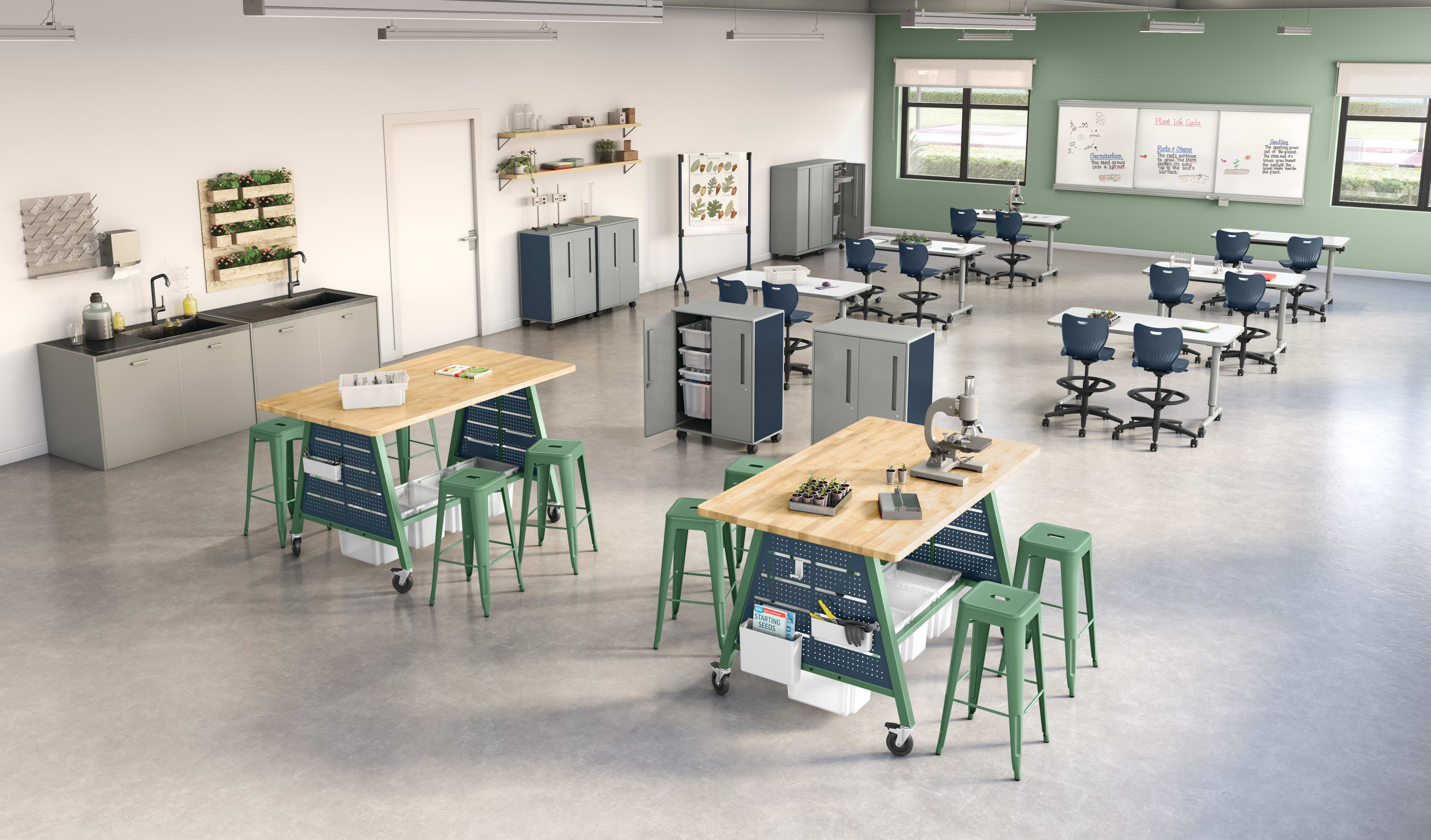HEST-R3060TAHH.N.FMQ1.K.C.P71.T1 – Field Trip Flip Top Table with Adjustable Leg; HSSST-18B.H.ON - SmartLink Task Stool; HEST3H2WS.C.N.AB.T1.NA.P8M.S - Class-ifi Tote Storage; HEMKR426042BB.N.LH903.C.P8S - Build Makerspace Table; HEMKREND42-SP.P8M - Build Makerspace Table End Panel; HAEHF.DW - Build Makerspace Table Accessories - Hot File; HFMBIN12.P099 - Build Makerspace Table Accessories - Bins; HE4LSTL30.P098 - Build Makerspace Stool; HMVMB-3672WW.C.P8M - Motivate Mobile Marker Board