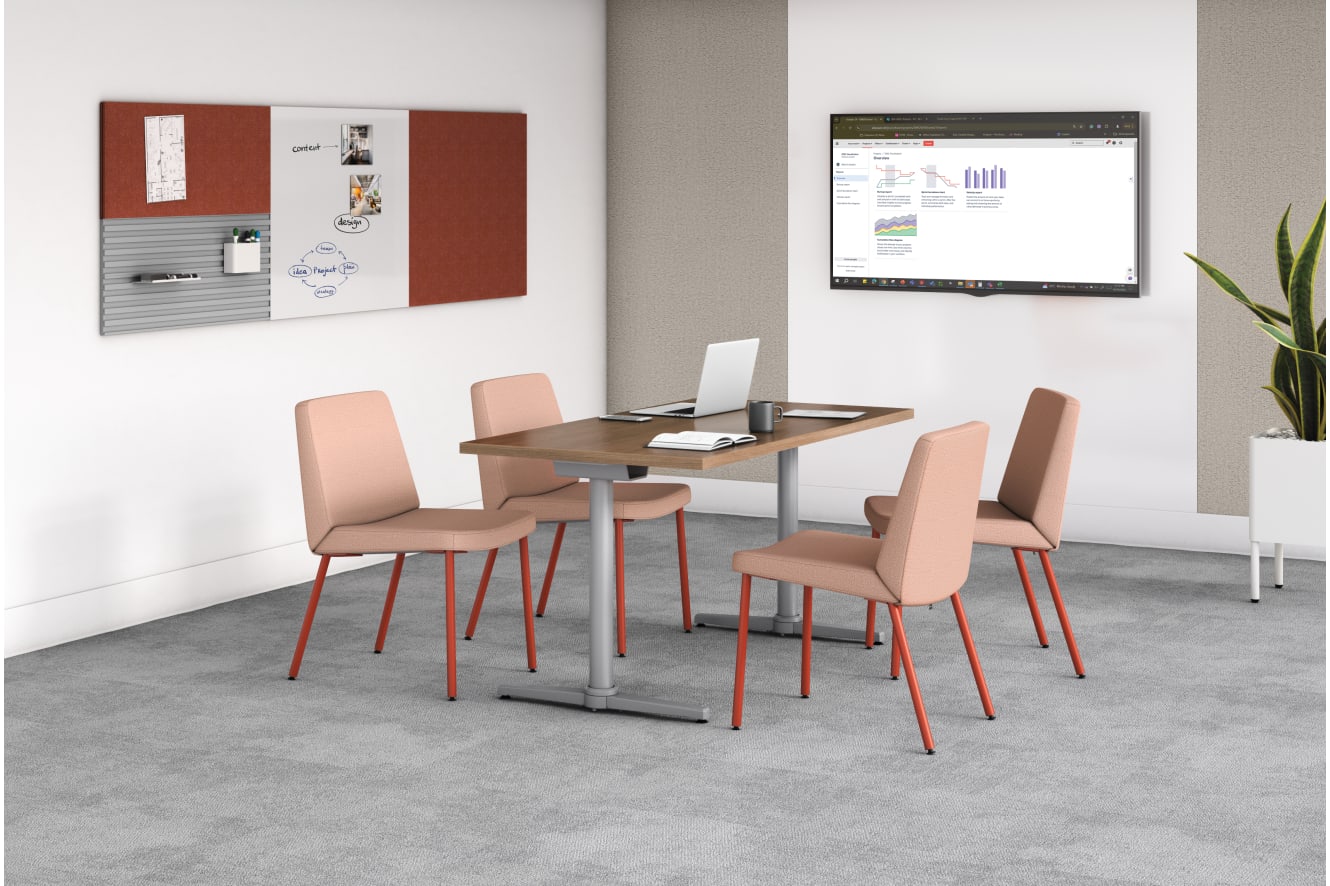 HFCG6.SNBLE23.P092 - Flock Guest Chair; HCTRECT3060.N.PINC.PINC - Arrange Rectangle Table Top; HCT29MT.PR8 - Arrange T-Leg Cafe Table Base; HCTSQR42N - Table Top; HSCS2.N.E.SNBLE23.PR8 - Arrange Cafe Height Stool; HWWT4524F.NBLE40 - Workwall Fabric Tile; HWWAP.PJW - Workwall Hanging File Folder; HWWAC.PJW - Workwall Cup Accessory; HWWARAIL24.PR6 - Workwall Tool Rail Accessory; HWWAH.PJW - Workwall Hook