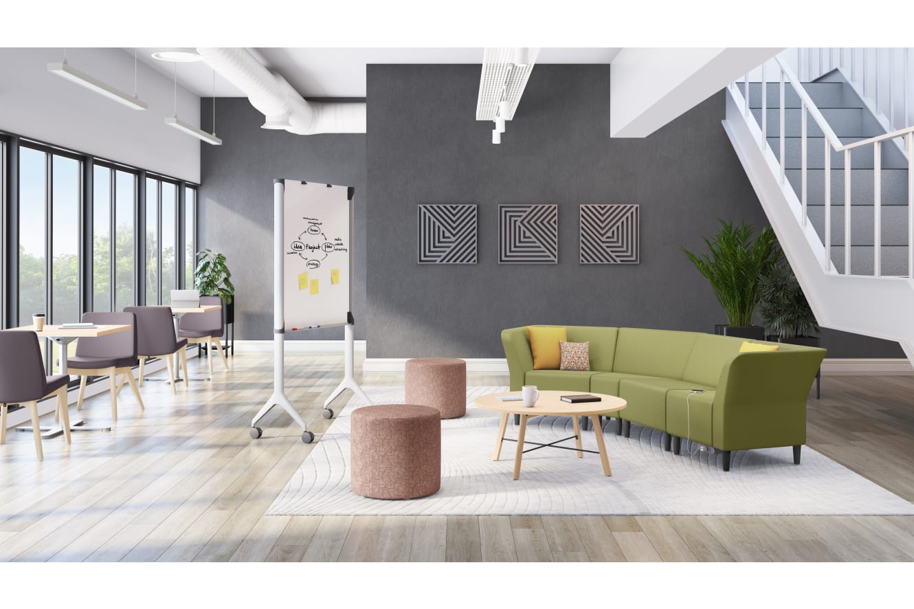 HFLMC1.TR.LIVI11.P7A - Flock modular chair; HFLMR1.TR.LIVI11.P7A - Flock modular right end; HFLWI45.TR.LIVI11.P7A - Flock inside wedge; HFLML1.TR.LIVI11.P7A - Flock modular left end; HFLY01.HG.S527931XP - Flock Mini cylinder; HFTLS30.GFE.N.LFWE - Flock 30" square table top; HFXB29B.P7A - Flock X-style base for 29 1/2"H tables; HFCG6WD.SXNY20.LE599 - Flock Casual guest wood leg chair; HSCCR36LM.LWFE.P7A - Scramble Coffee Table; HTLSCUSQRPLNT15H.S – Sculpt 15" high square planter; HURNDPWRMOD.AV.S.STRM – Power Module