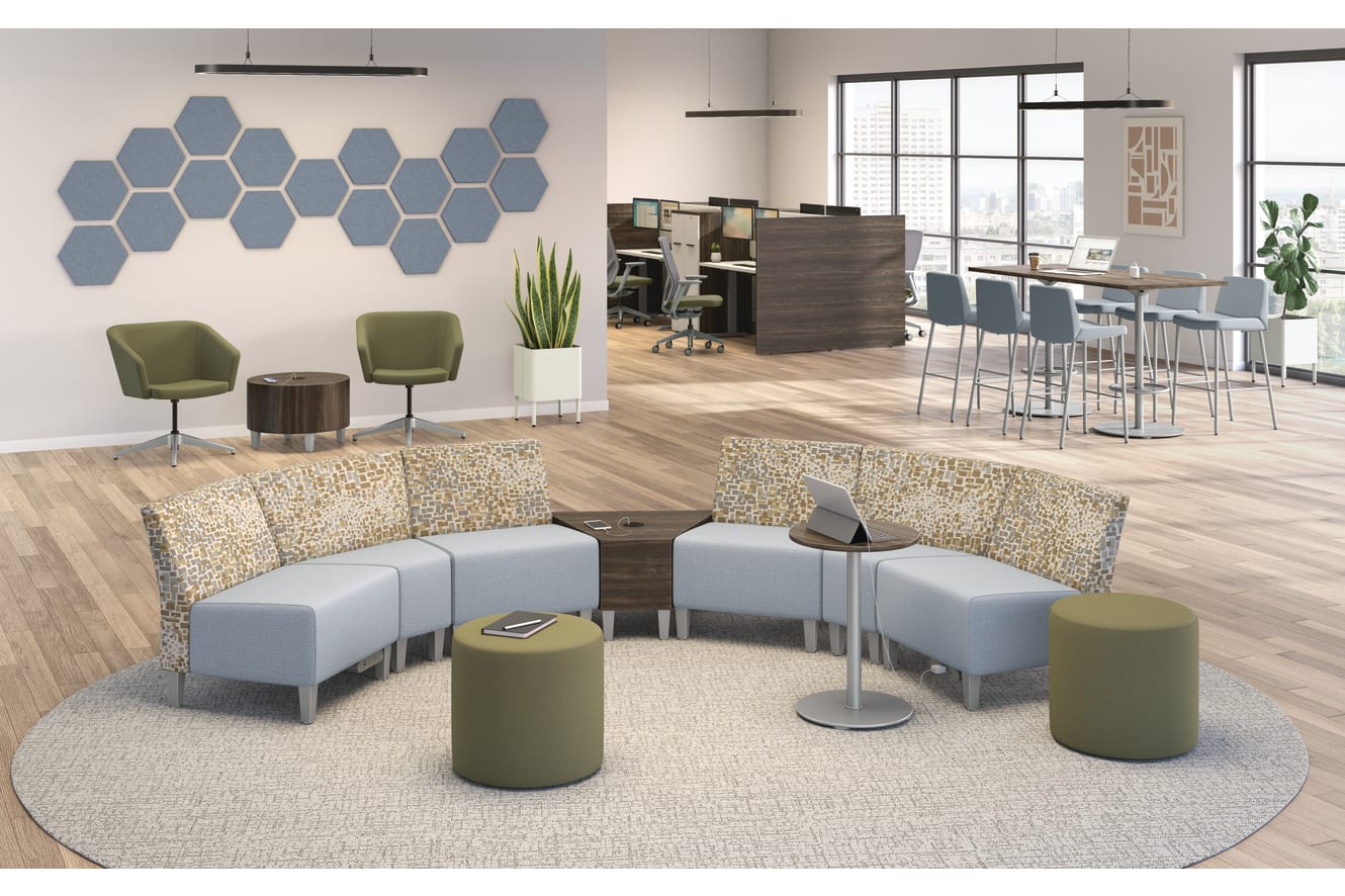 HFLMC1DF.TS.SMHMTSA001.SNBLE33.PR8 – Flock Modular Chair; HFLSC2.HAML26.4SPR8 – Flock Square Chair; HFLWI45DF.TS. SMHMTSA001.SNBLE33.PR8 – Flock Inside Wedge; HFLYO1.HG.HAML26 – Flock Round Mini; HFSS74L.SNBLE33.PR8 – Flock Stool; HFTLC3384.GFW.GT1.LFW1 – Flock Rectangle Top, 33x84; HFDB42AFN.PR8 – Flock Disc Base w/Footring, 41H; HFTLD26.G0.LFW1.TS.PR8 – Flock Cylinder Table; HFTLW45.G0.LFW1.TS.PR8 – Flock Wedge Table; HFTPTL18.GFW.LFW1.PR8 – Flock Personal Table; HTLSCUSQRPLNT15L.LOFT.G - Sculpt 15" Square Low Planter; HGRMTUSB2 – Power Hub; HFXT1.F0.STC.A.TS.IT.HAML26.NL.SB.TI – Flexion Chair; HHATB2S2LC - Coordinate Ht Adjustable Base; HHATW2258CT - Worksurface, 58Wx22D; HRVG5063L - Gallery Panel; H105ST122450L and H105ST122450R - 10500 Series Slide Out Tower; HUSFUPM2058 - Universal Screen, Fabric Up-mount; HETP5030FP - Tackable Panel; HETP5024FP - Tackable Panel