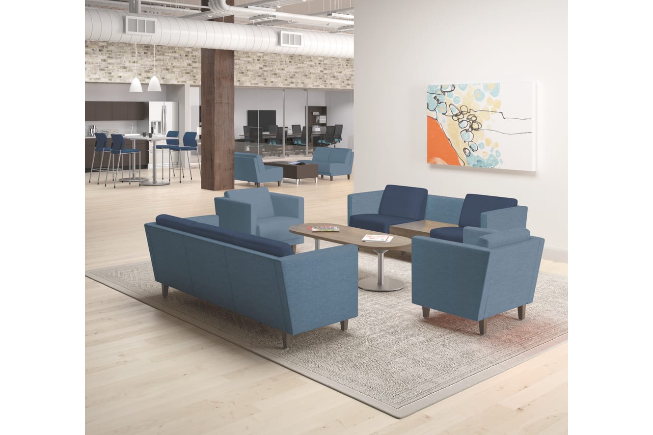 HML3S.A.PBLE10.SED10.TS.PINC - Grove Three-seat lounge; HML1S.A.PBLE10.TS.PINC - Grove Single seat lounge (2); HML2ST.A.PBLE10.SED10.TS.PINC.PINC.N.0 - Grove Two-seat lounge w/table; HFTLA2460.GPINC.N.PINC - Flock 60” racetrack table top; HFDB17N.PR8 - Flock Disc-style table base, 18”H; HML2S.N.PBLE10.TS.PINC - Grove Two-seat lounge (2); HFTLS24.N.0.PINC.PR8 - Flock Cube table; HFSS74.SED10.PR8 - Flock 4-leg stool;