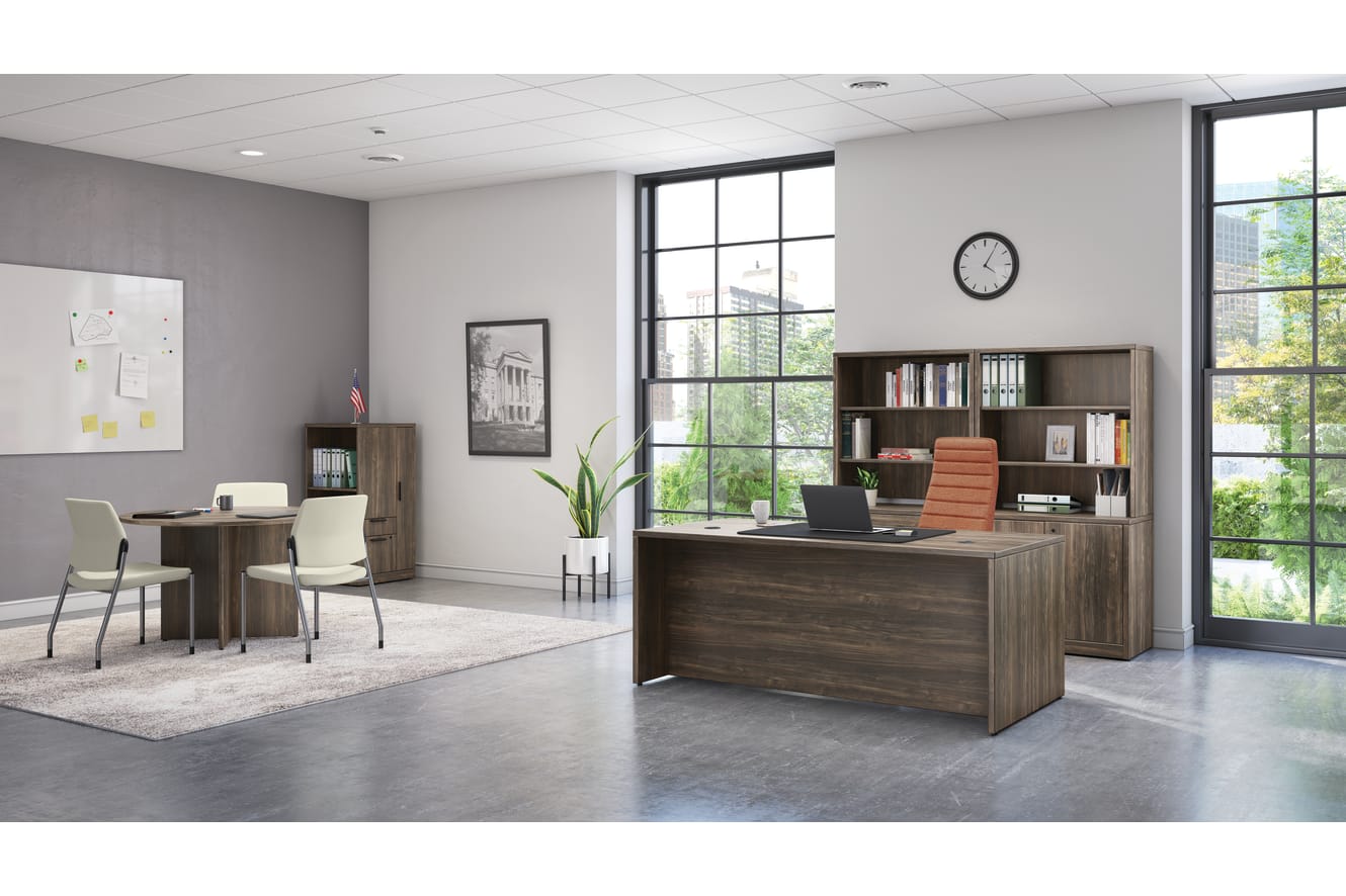HCFEU.W0.STC.P.H.PBLE01.CHSTC00.PA– Cofi Executive Chair; HIGS6.N.E.U.WP70.PLAT – Ignition Upholstered Guest Chair ; H105LT242450SBFR – 10500 Series Side Access Wardrobe Tower; H10593.LFW1LFW1 – 10500 Series Double Pedestal Desk ; H105292. FW1LFW1– 10500 Series Bookcase Hutch; H10563. FW1LFW1– 10500 Series 2-Drawer Lateral File; H105291. FW1LFW1– 10500 Series Storage Cabinet with Doors; HTLD42.LFW1FW.N.LFW1 – Preside Laminate Round Top; HTLXP42.LFW1 – Preside Laminate Panel X-Base