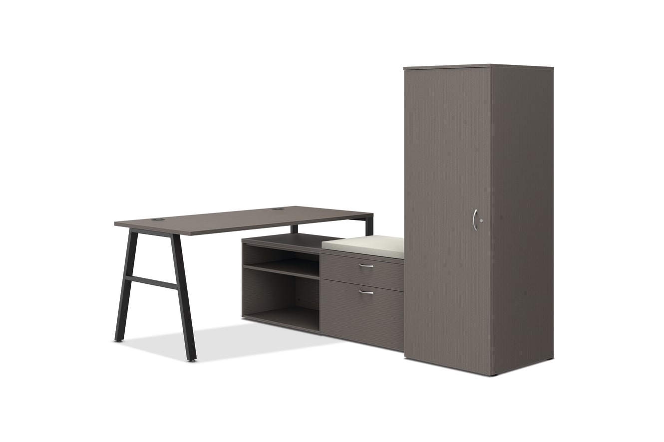 HLPL8460LDSKSL1ALEGB – Bundle; HLPLRW6030.LSL1 – Mod 60W x 24D Worksurface; HLPLSL30.BLKP – Mod External Stiffener; HLPLLEG30A.BLKP – Mod A-leg Support; HLPLCL3020S.LSL1 – Mod 30W x 20D x 21H Open Storage Cabinet for Low Credenza; HLPLCL3020BF.LSL1 - Mod 30W x 20D x 21H 2-drawer Personal Cabinet for Low Credenza; HLPLCL6020TOP.LSL1 – Mod 60W x 20D Cabinet Top; HLPLCSEAT3020.CN02 – Mod Low Credenza Cushion; HLPLW2424.LSL1 – Mod Wardrobe