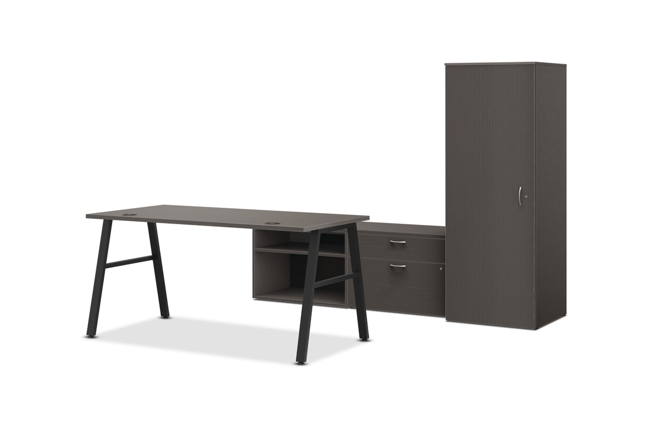 HLPL8486EXECSL1ALEGB – Bundle; HLPLRW6030.LSL1 – Mod 60W x 24D Worksurface; HLPLLEG30A.BLKP – Mod A-leg Support; HLPLCL3020S.LSL1 – Mod 30W x 20D x 21H Open Storage Cabinet for Low Credenza; HLPLCL3020BF.LSL1 - Mod 30W x 20D x 21H 2-drawer Personal Cabinet for Low Credenza; HLPLCL6020TOP.LSL1 – Mod 60W x 20D Cabinet Top; HLPLW2424.LSL1 – Mod Wardrobe