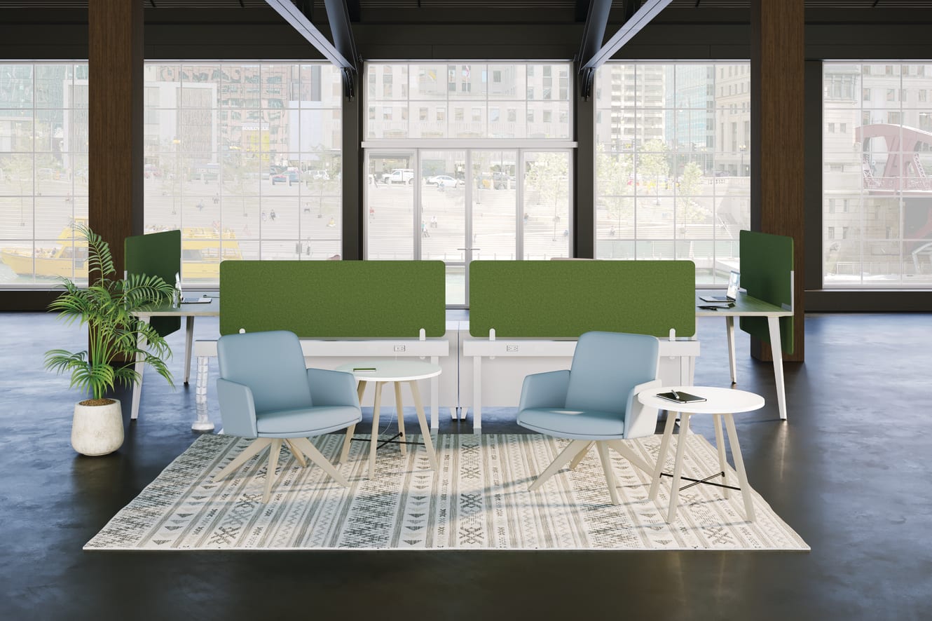 HIWMU.Y1.A.H.SUF554200.NL.SB.T - Ignition 2.0 Upholstered Task Chair; HMAVMAMF.SMHMMER14.SMHMMER14.WDLKI1 - Mav mid-back 4 leg chair; HSCER24LM.LDW1DW.LKI1.P8X - Scramble Round End Table 24′′D x 22′′H; HUSPGRV2048.DGN1.PJW - Gravitation Beam PET Screen; HUVDSHAB6013.DGN1.PR6 - Above/Below PET Desktop Screen; HBEAM48.PJW - Gravitation Beam, 48"