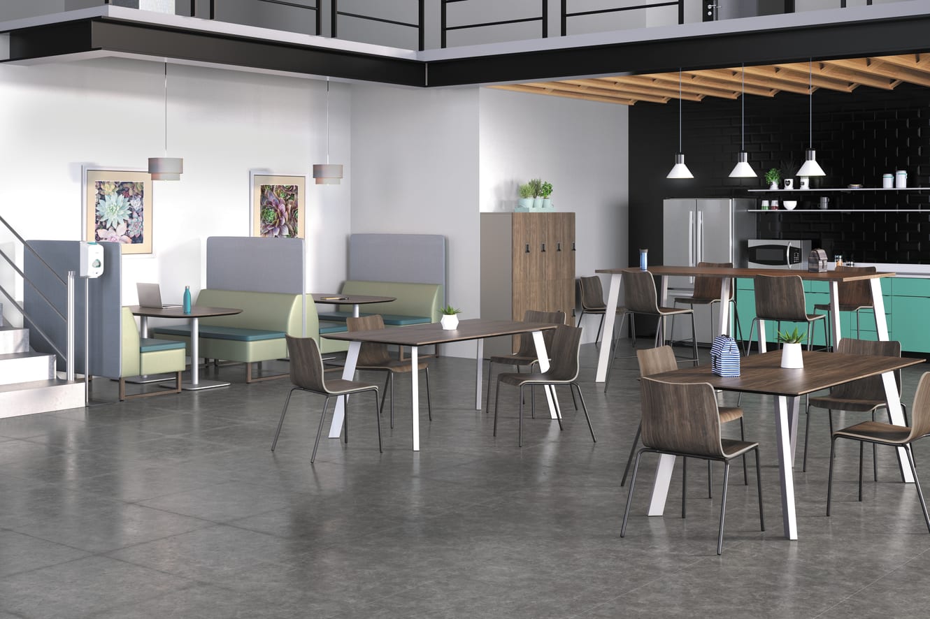 HTLC3672.JPINC.N.PINC - Preside rectangle table top; HT29AL72.PJW - Preside seated height angled legs; HTLC4296.GPINC.N.PINC - Preside rectangle table top; IHT42AL96.PJW - Preside standing height angle legs; HCWTB3656J.N.PINC.PINC - Birk booth top; HCWTDSBM27.PR8 - Birk double pedestal base; HRUCK1L.PINC.BLCK - Ruck laminate chair; HRUCK5L.PINC.BLCK - Ruck laminate stool; HASHB2MF.A.UR82.WP90.UR82.LGT.SWPINC - Astir seating;