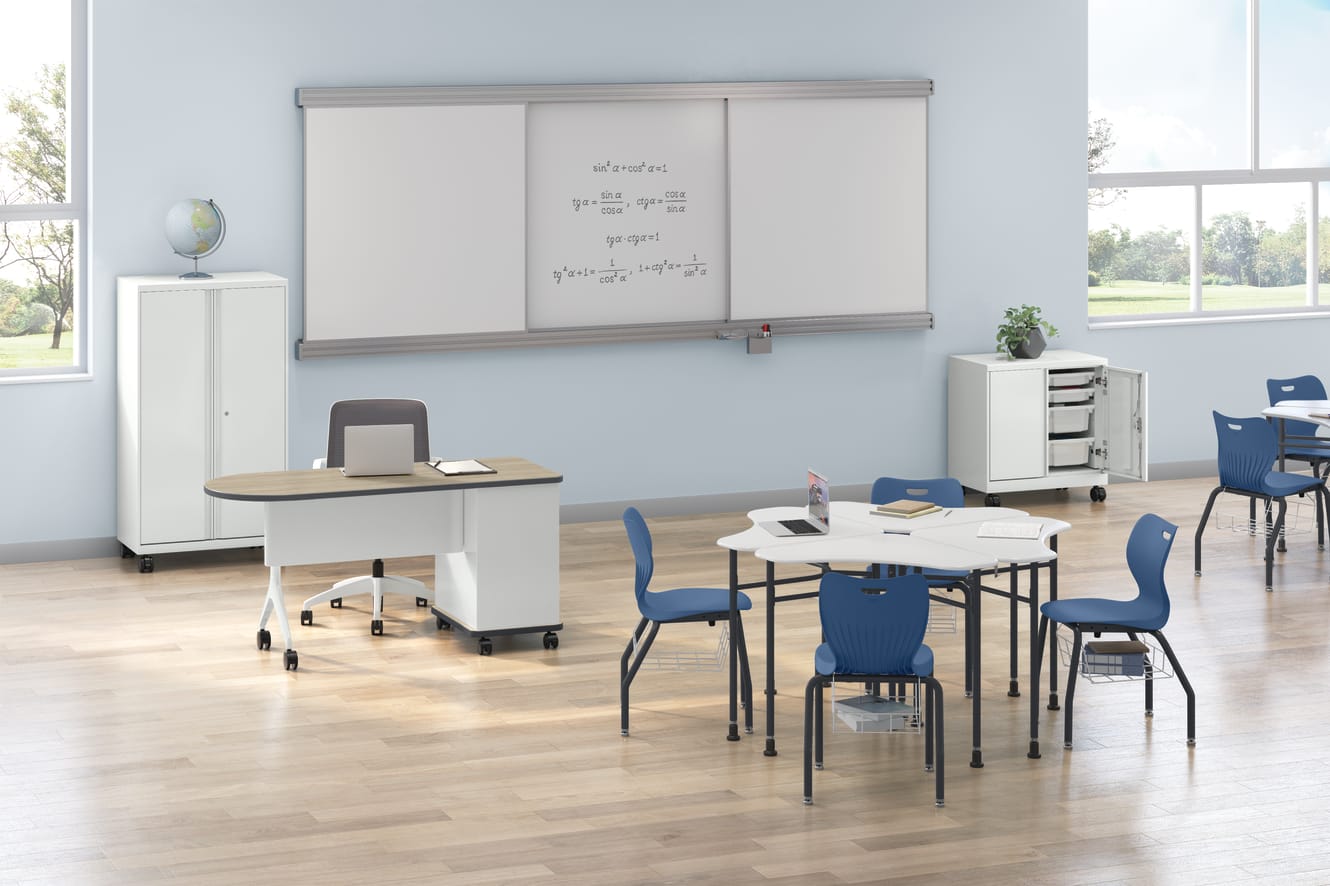 HLVMSC5630R.L.PJW - SmartLink Mobile Cabinet with Bins, 56H; HLVMSC3330R.L.PJW - SmartLink Mobile Cabinet with Bins, 32-1/4H; HLTV2460TMOD-3.LKI1.S.PJW - SmartLink Teacher Station with Modesty Panel, Peninsula; HLDV-M3T.E.G1.S- SmartLink Student Desk, Sit-to-Stand; HSS4L-16B.E.BT.S - SmartLink 16H 4-Leg Chairs; HSSA-WB1618 - SmartLink Wire Storage Basket; HLWR-12 - 144 Wall Rail; HLWBF1-1248W.X - SmartLink Learning Board, Fixed Whiteboard, 1-sided 144Wx48H; HLWBS-448WT.X - SmartLink Learning Board, Sliding Whiteboard/Tackboard 48Wx48H; HCLQT.W0.TC2.F.S.IC.SMHMMOD02.NL.SB.DW - Cliq Task Chair