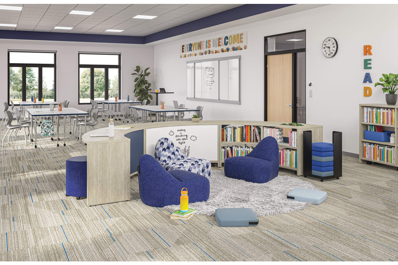 HESWCD30.C.LKI1.P097 - Storyline 30H Bookcase, Curved, Dual Sided; HESWCO30.C.LKI1.MKB - Storyline 30H Bookcase, Curved Out, Single Sided; HESWCB30.G.LKI1.P097 - Storyline 30H Bistro Table, Curved; HESWLS42.C.LKI1.P097 - Storyline 42H Bookcase, Linear, Single Sided; HFLYO1.H.1042-57 – Flock Round Mini; HEFL1.1042-57 – Confetti Floor Lounge; HEFL1.1040-55 – Confetti Floor Lounge; HELP1.SXNY09 – Confetti Floor Cushion; HELP1.SXNY13– Confetti Floor Cushion; HECART.P71 – Confetti Floor Cart; HSS4L-18B.E.PT.PLAT – SmartLink Chair, 18H; HETR2448E.N.LDW1.RE - Build Rectangle Top, 48x24; HEB4LEG.T1 - Build Leg 4pk; HHABCASTER - Build Casters; HETLEC-REC2430.N.LDW1.P.P71.P71 - Roll Call Lectern; HLWR-12 - SmartLink Wall Rail; HLWBF1-1248W - SmartLink Fixed Whiteboard; HLWBS-448WW - SmartLink Sliding Whiteboard, 48x48; HLWBS-248WW - SmartLink Sliding Whiteboard, 24x48