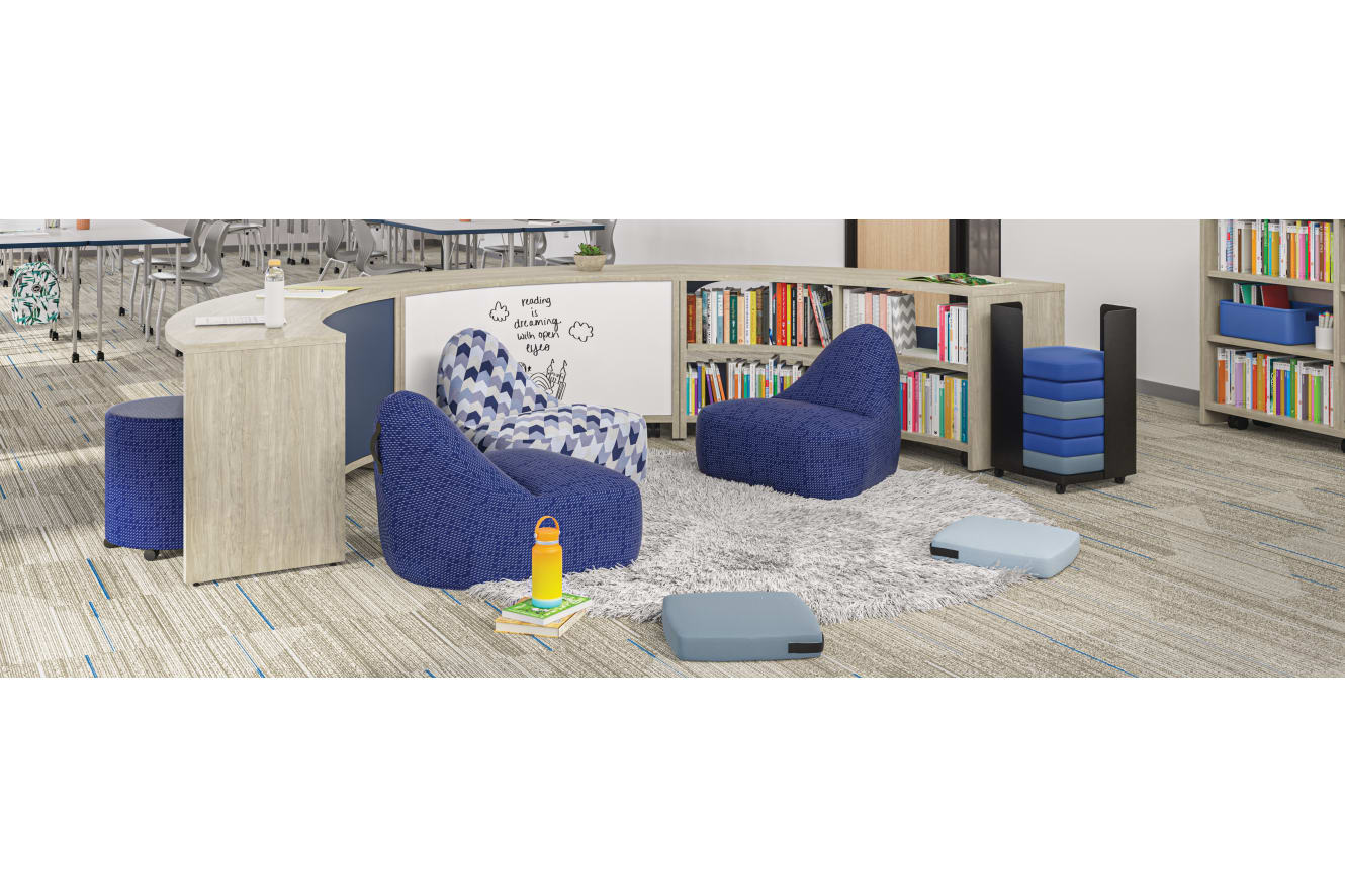 HESWCD30.C.LKI1.P097 - Storyline 30H Bookcase, Curved, Dual Sided; HESWCO30.C.LKI1.MKB - Storyline 30H Bookcase, Curved Out, Single Sided; HESWCB30.G.LKI1.P097 - Storyline 30H Bistro Table, Curved; HESWLS42.C.LKI1.P097 - Storyline 42H Bookcase, Linear, Single Sided; HFLYO1.H.1042-57 – Flock Round Mini; HEFL1.1042-57 – Confetti Floor Lounge; HEFL1.1040-55 – Confetti Floor Lounge; HELP1.SXNY09 – Confetti Floor Cushion; HELP1.SXNY13– Confetti Floor Cushion; HECART.P71 – Confetti Floor Cart; HSS4L-18B.E.PT.PLAT – SmartLink Chair, 18H; HETR2448E.N.LDW1.RE - Build Rectangle Top, 48x24; HEB4LEG.T1 - Build Leg 4pk; HHABCASTER - Build Casters; HETLEC-REC2430.N.LDW1.P.P71.P71 - Roll Call Lectern; HLWR-12 - SmartLink Wall Rail; HLWBF1-1248W - SmartLink Fixed Whiteboard; HLWBS-448WW - SmartLink Sliding Whiteboard, 48x48; HLWBS-248WW - SmartLink Sliding Whiteboard, 24x48