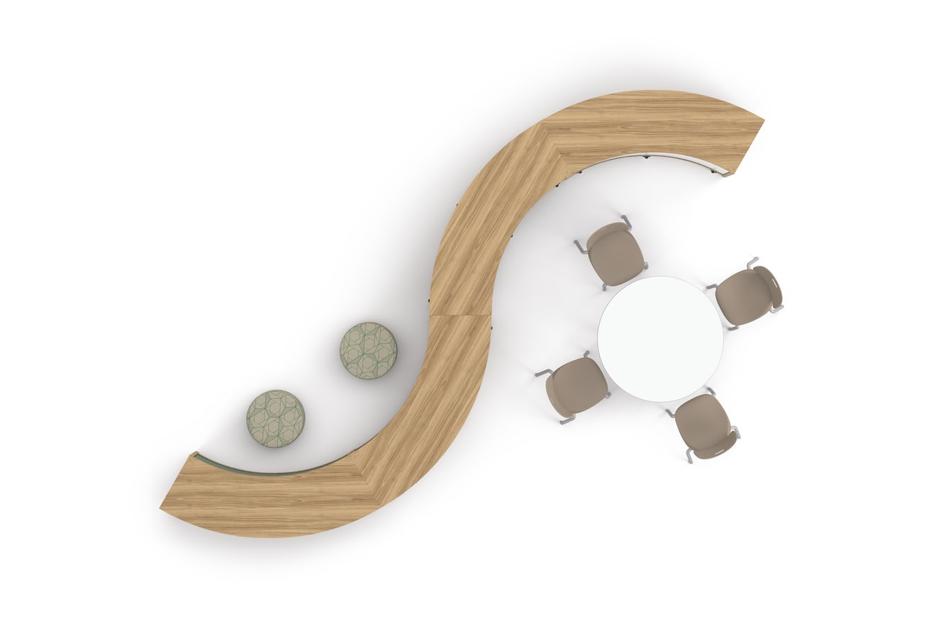 HESWCO42.C.LFC1.P095 - Storyline 42H Bookcase, Curved Out, Single Sided; HESWCO42.C.LFC1.MKB - Storyline 42H Bookcase, Curved Out, Single Sided; HESWCO30.C.LFC1.P095 - Storyline 30H Bookcase, Curved Out, Single Sided; HFLYO1.H.973-67 – Flock Round Mini; HERD42E.N.LDW1.K – Build Round Top, 42Dia; HEB4LEG.T1 - Build Legs 4pk; HSS4L-18B.E.SD.PLAT – SmartLink Chair, 18H