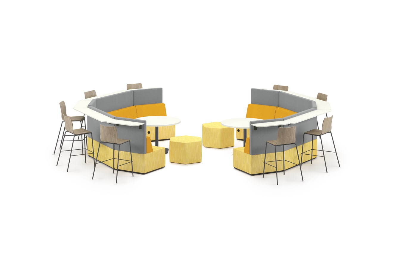 HECSMSBBMF.1R.RUSH23.CU27.CU22.PP71.LOFT.LOFT - Tangram Square Bistro-Back; HECSMTBBMF.1R.RUSH23.CU27.CU22.PP71.LOFT.LOFT - Tangram Trapezoid Bistro-Back; HECSVHP.RUSH23.G - Tangram Varsity Hexagon Pouf; HRUCK5L.LKI1.P7A - Ruck Laminate Stool; HCWTSBM27.P7A - Birk Working-Lounge Height Single Pedestal Base; HCWTRND42G.N.LOFT.LOFT - Birk 42W Round Table Top
