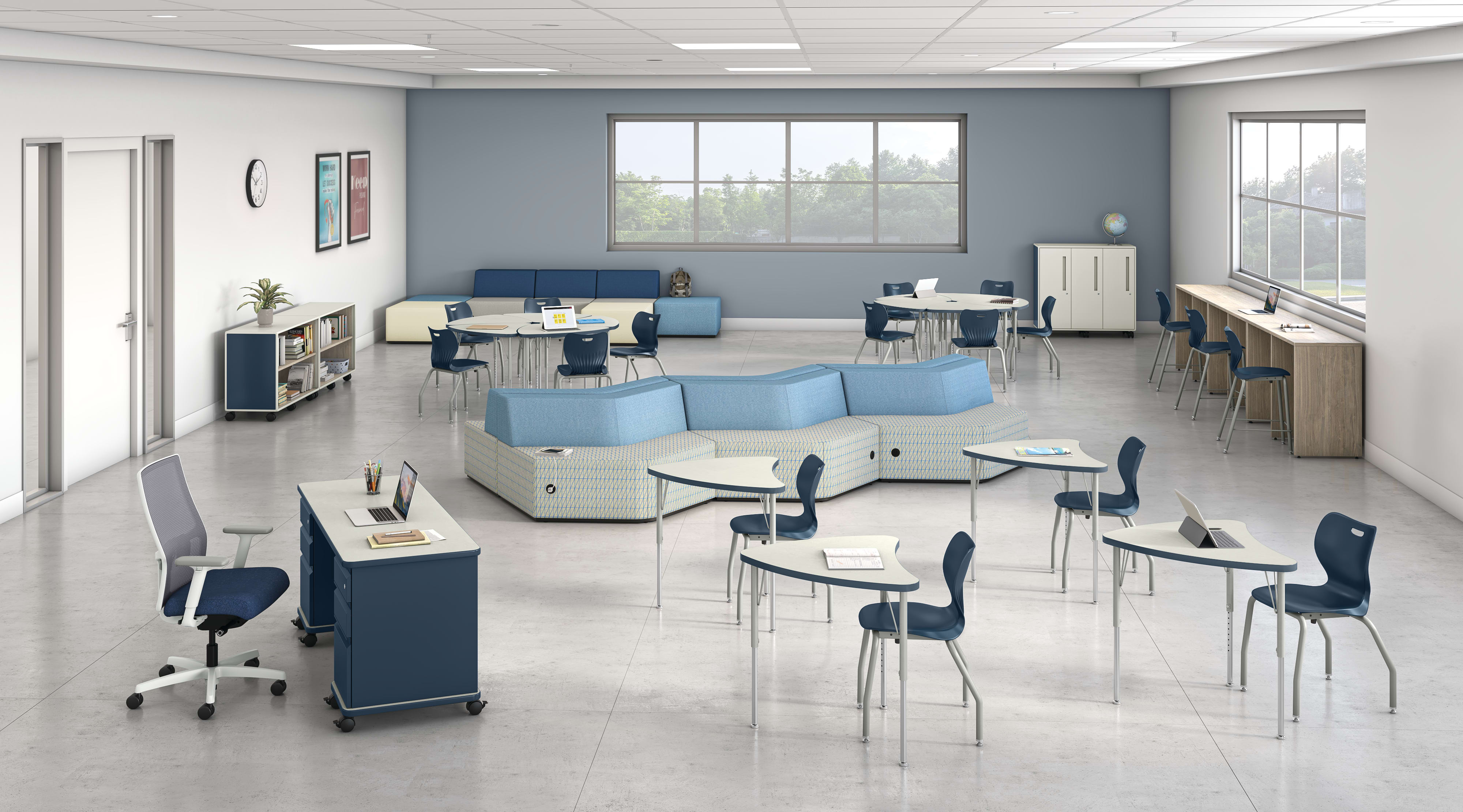 Study hall classroom with Build student desks, blue SmartLink chairs, and soft seating.