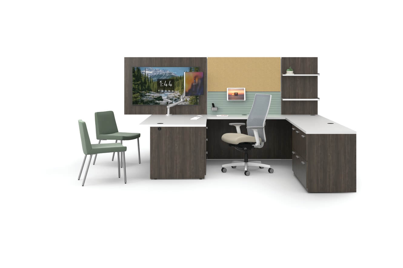 Desk: HNL2436LD2.GDW.C.LDW1.LFW1.LFW1 - Concinnity 36x24x29 Lateral File 2 drawer, Designer White top with Florence Walnut; HNL2472RP.GDW.C.P.LDW1.LFW1.LFW1 - Concinnity 72x24x29 Rt Ped Credenza, Designer White top with Florence Walnut; HNL2448BF.GDW.P.LDW1.LFW1 - Concinnity 48x24x29 Bridge w/ full modesty, Designer White Top with Florence Walnut ; HNL3672LPRBF.GDW.C.P.LDW1.LFW1.LFW1 - Concinnity 72x36x29 LP Desk Rectangle Top BKFT Frost Mod, Designer White Top with Florence Walnut ; Chairs: HIWMM.Y2.V.TS.IT.RS31.DW.SB.DWX - Ignition Mesh with Designer White Frame and Base; HFCG6.PRKR01.PR8 - Flock Guest with Parker Aloe; Workwall: HWWT3754V.LFW1FW.PJW - 37.5"Hx54"W Laminate Media Tile, Florence Walnut with Designer White brackets; HWWT2248F.PCAMBLT48.PJW - 22"Hx48"W Fabric Tile, Blazer Lite Bliss with Designer White Brackets; HWWT1548T.P8A.PJW - 15"Hx48"W Slotted Tool Tile, Succulent with Designer White brackets; HWWT3724L.LFW1FW.PJW; HWWASHELF24.LDW1DW.TI; HWWAC.T1; HWWATS.T1